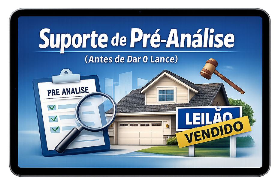 Um checklist prático para usar antes de qualquer lance. Você confere pontos críticos do imóvel, edital, matrícula, dívidas e estratégia de saída. Se o imóvel passar pelo checklist, você sabe que está tomando uma decisão consciente e protegida.